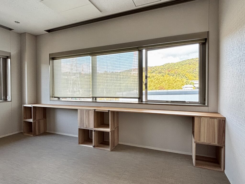 天板のサイズをオーダーメイドしたことで造作家具に見え、「もくわく」のもつ木の質感と控えめなデザインが既存の空間に溶け込みました。